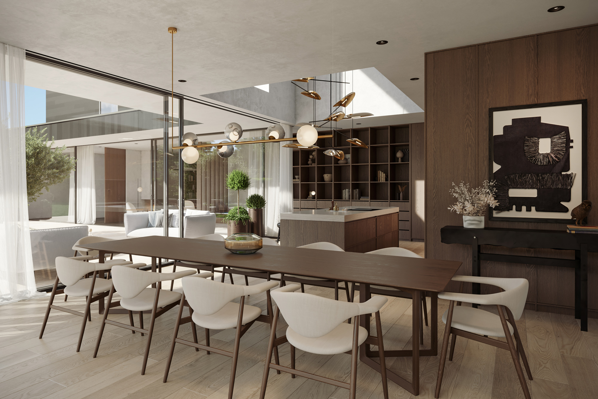 In der wunderschönen Villa, die wir Ende 2025 für eine junge Familie in Niederösterreich fertiggestellt haben, verschmilzt auf 450m² Wohnfläche das Innere mit dem Äußeren. Durch die L-förmige Architektur entstand ein zentraler Innenhof, in dem sich das Familienleben größtenteils abspielt.