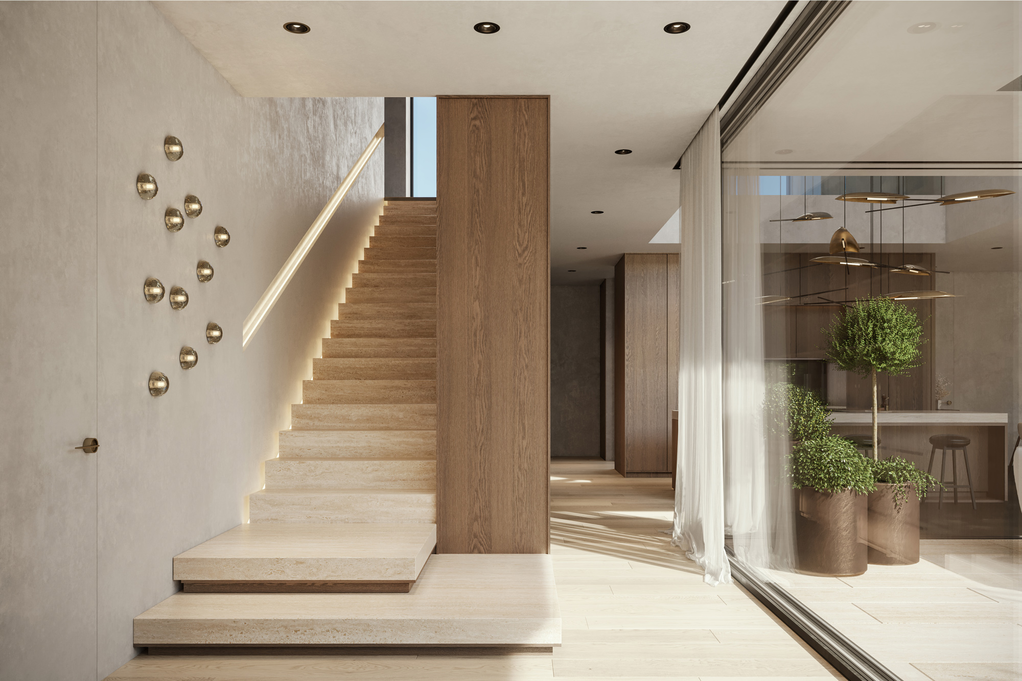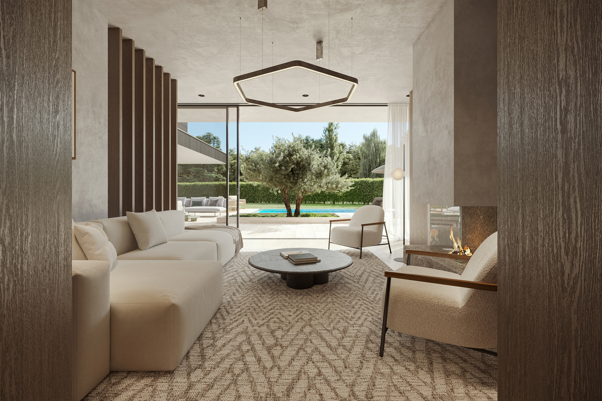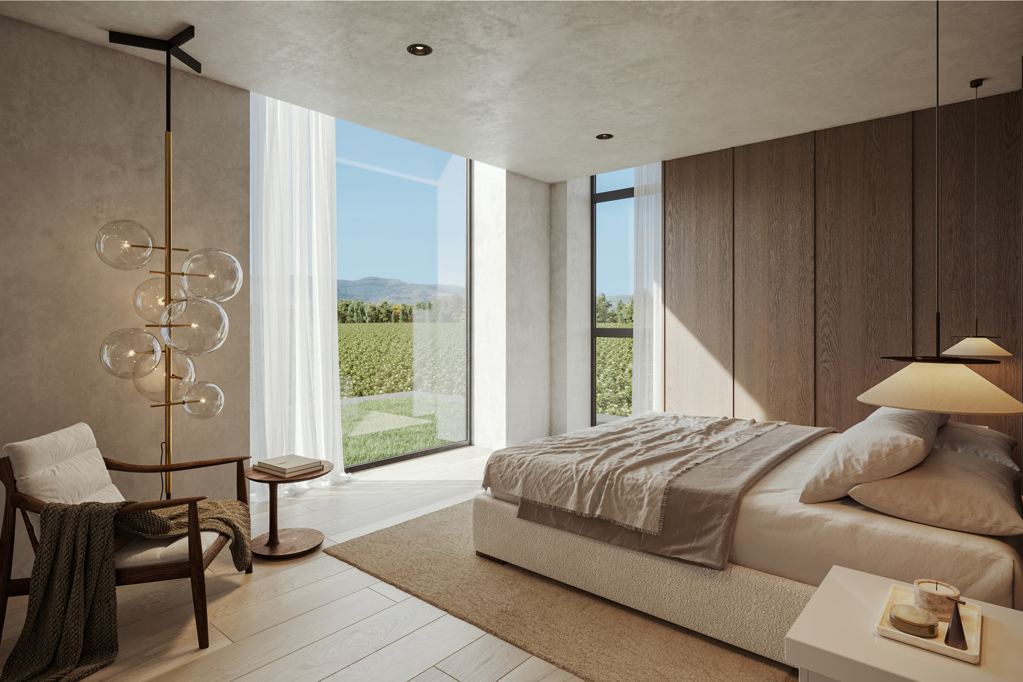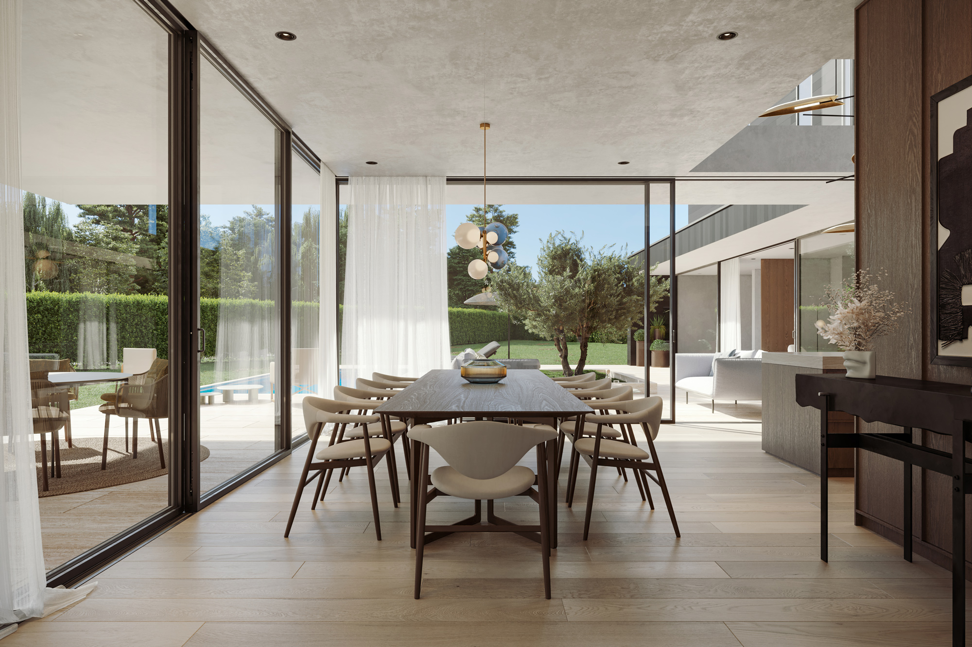 Die Ausrichtung, sorgfältig gewählte Proportionen sowie natürliche Materialien sorgen dafür, dass die Villa sich nahtlos in die umgebende Landschaft einfügt.